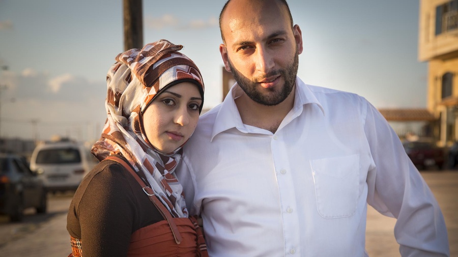 在约旦城镇伊尔比(Irbid)北部一所小房子,30岁的米尼亚(Minear)、21岁的古娜(Khoula)和亲戚们住在同一屋檐下。他们没什么丰盛菜肴,有的是叙利亚人传统的好客精神,既乐意邀请访客留下一起午饭,还奉上味道清甜的薄荷茶。用膳后,两口子依偎在一起,娓娓道来他们的爱情故事。