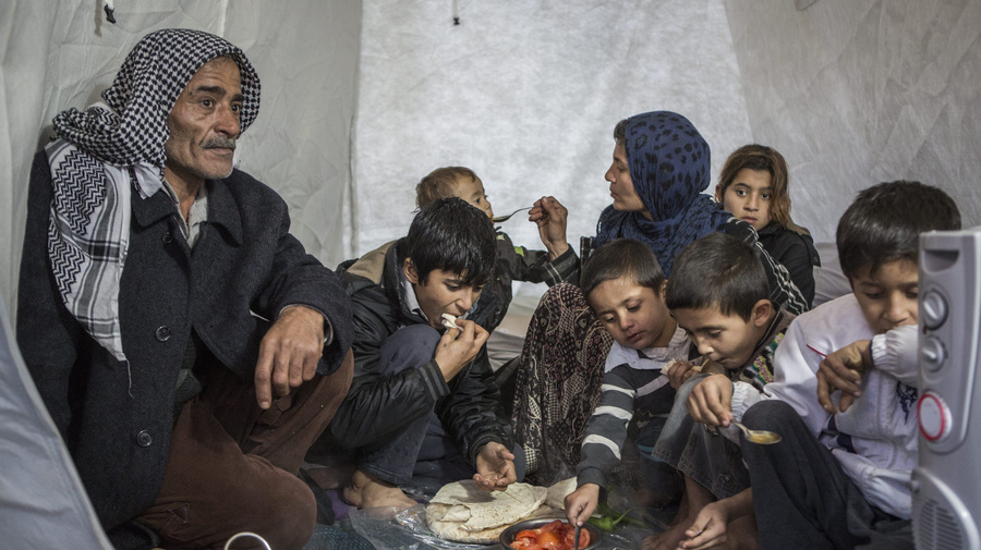 一個典型的敍利亞難民家庭故事;父母親看到疲累及饑餓的孩子終於在難民營裡得到熱食,稍感安心,但仍心擊家園,希望能早日回家。UNHCR/Ivor Prickett