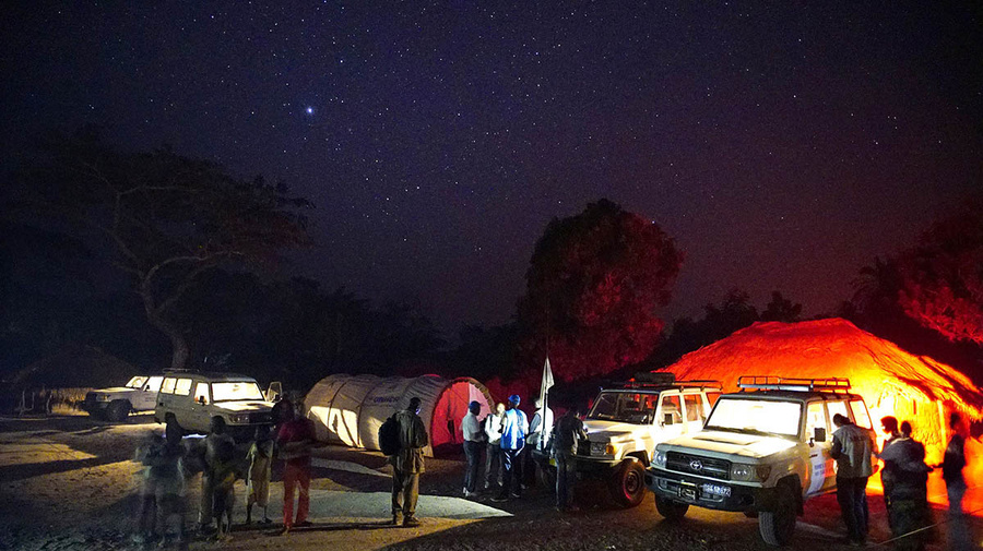 夜幕低垂, 救援人員在剛果民主共和國的邊境駐紮。UNHCR/Brian Sokol