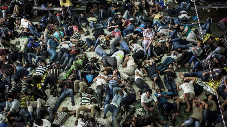 尋求庇護者與經濟移民在擁擠的貨艙甲板上,等待危險的渡海旅程過去。乘客中包括逃離家鄉戰火亟需國際社會保護的難民。© UNHCR/A.D'Amato