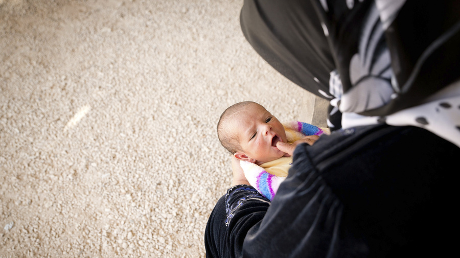 Ziad(手抱嬰兒)出生後的第一站先到帳篷外的聯合國難民署登記,避免成為無國籍人士。同時,他也要向約旦政府(收容國)登記,以取得出生證明。UNHCR / J. Kohler