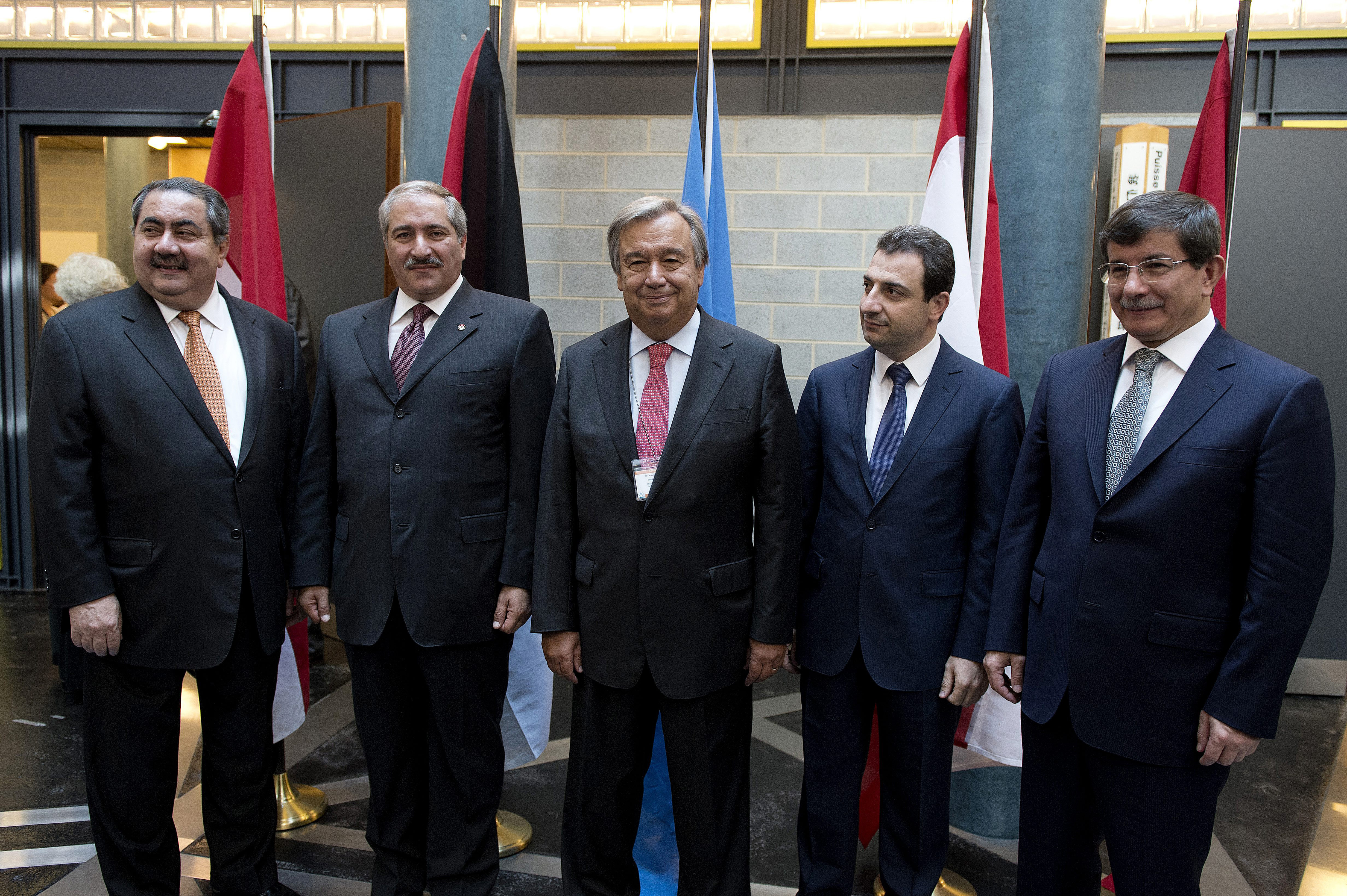 難民署高級專員安東尼奧‧古特雷斯(António Guterres) 與土耳其、黎巴嫩、伊拉克、和約旦外長,今天於日內瓦進行會議前合影。© UNHCR/J-M.Ferre