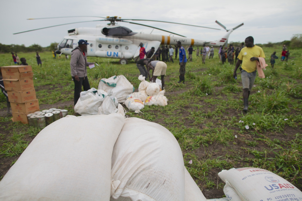 聯合國直升機在南蘇丹Jonglei 州Dorein村落卸載緊急糧食為成千上萬因戰亂而流離失所人士提供人道救援。© UNHCR/T.Irwin