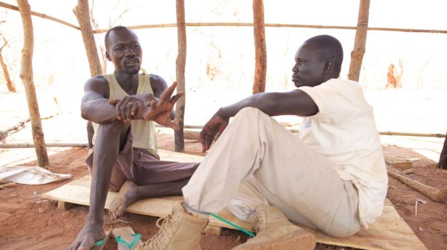 Hassam Neel Salom在南苏丹这个刚投入运作的Ayoung Thok难民营,向一名管理营地的丹麦难民理事会成员表示,他会在住处完成建造自己的庇护所后带家人迁进这里。© UNHCR/T.Irwin