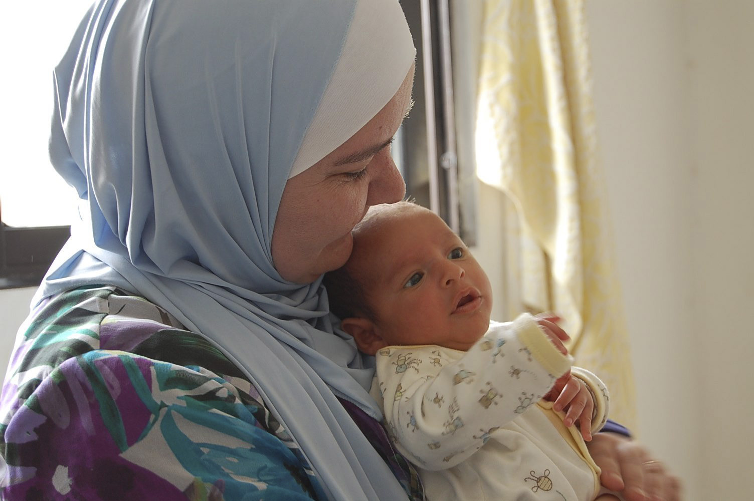 聯合國難民署前線員工Huda Al-Shabsogh,在Irbid將一名剛出生的敘利亞難民嬰兒抱在懷裡。© UNHCR/A.Purvis