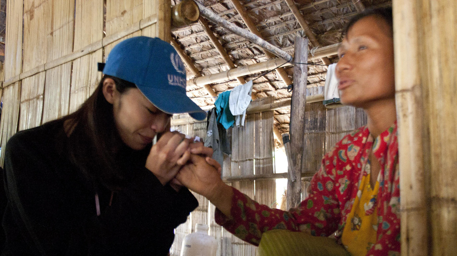 一位39岁的克伦族妇女诺 ·罗扎(Naw Roza)讲述自己从5岁起的种种遭遇,中国演员姚晨不禁潸然泪下。© UNHCR / K. McKinsey