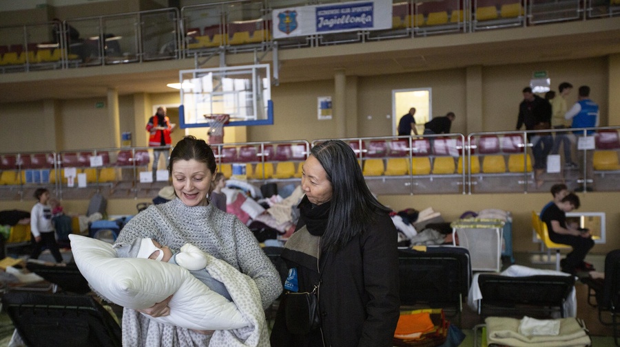 在波兰边境小镇梅迪卡的一处体育中心里,数百张行军床占据了曾经的比赛场地。这是为被迫逃离乌克兰的难民所准备的临时住所。在周遭孩童的嬉闹和嘈杂的人声中,瓦伦蒂娜抱紧了她两个月大的侄子安德里,努力理清自己的思绪,回忆过去几天中的遭遇。