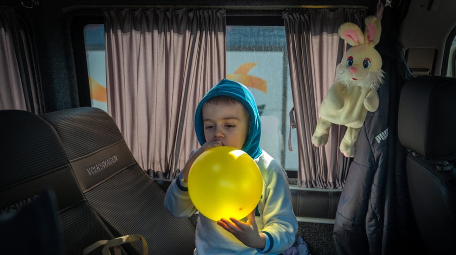 一名乌克兰儿童在跨越边境的大巴车上。© UNHCR/Dario Bosio