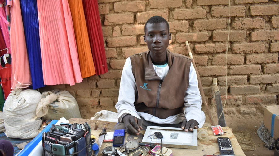 自从来到乍得后,他改行修理手机——他通过在自己的手机上练习学会了这项技能,他每天能赚到1000至1500中非法郎(约合1.7-2.6美元)。