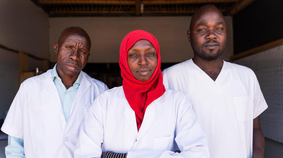 (从左至右)来自苏丹西达尔富尔的难民哈桑·扎卡伊拉、法蒂玛·阿卜杜勒加迪尔和雅各布·伊德里斯安目前在乍得阿布坦盖难民置点的一所医院工作。©UNHCR/ Ala Kheir