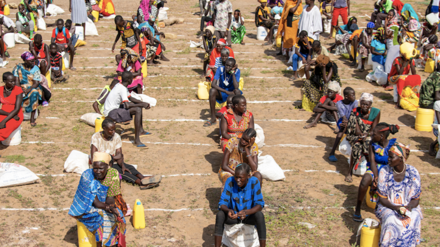在肯尼亚的Kakuma难民定居点,南苏丹难民在等待食品发放时,保持社交距离。© UNHCR/Samuel Otieno