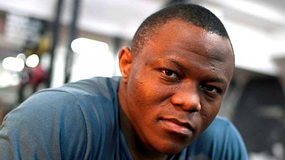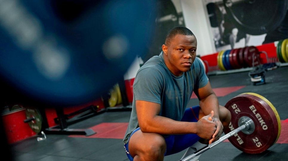 2019年5月,奥运难民代表团举重运动员西里尔·特查特切特在英国伦敦密德萨斯大学体育馆训练。 © 联合国难民署/贝拉·松代尔斯基