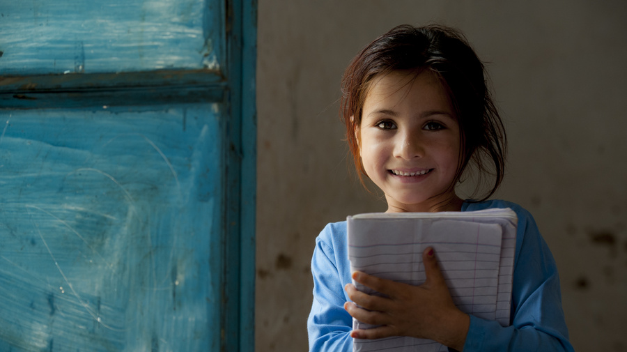 在巴基斯坦,五岁的阿富汗难民女孩在女教师艾琪拉开设的学校上学。由于对阿富汗难民教育的突出贡献,艾琪拉老师于2015年获得联合国难民署授予的南森难民奖。 © UNHCR/Sebastian Rich