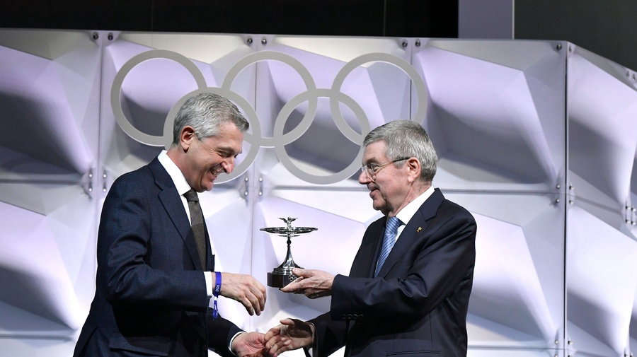 国际奥组委主席巴赫向联合国难民署难民事务高专格兰迪颁发奥林匹克奖杯。© IOC/Christophe Moratal