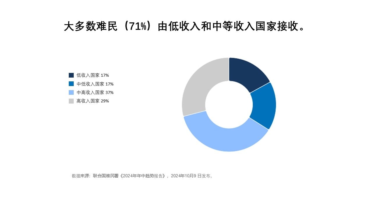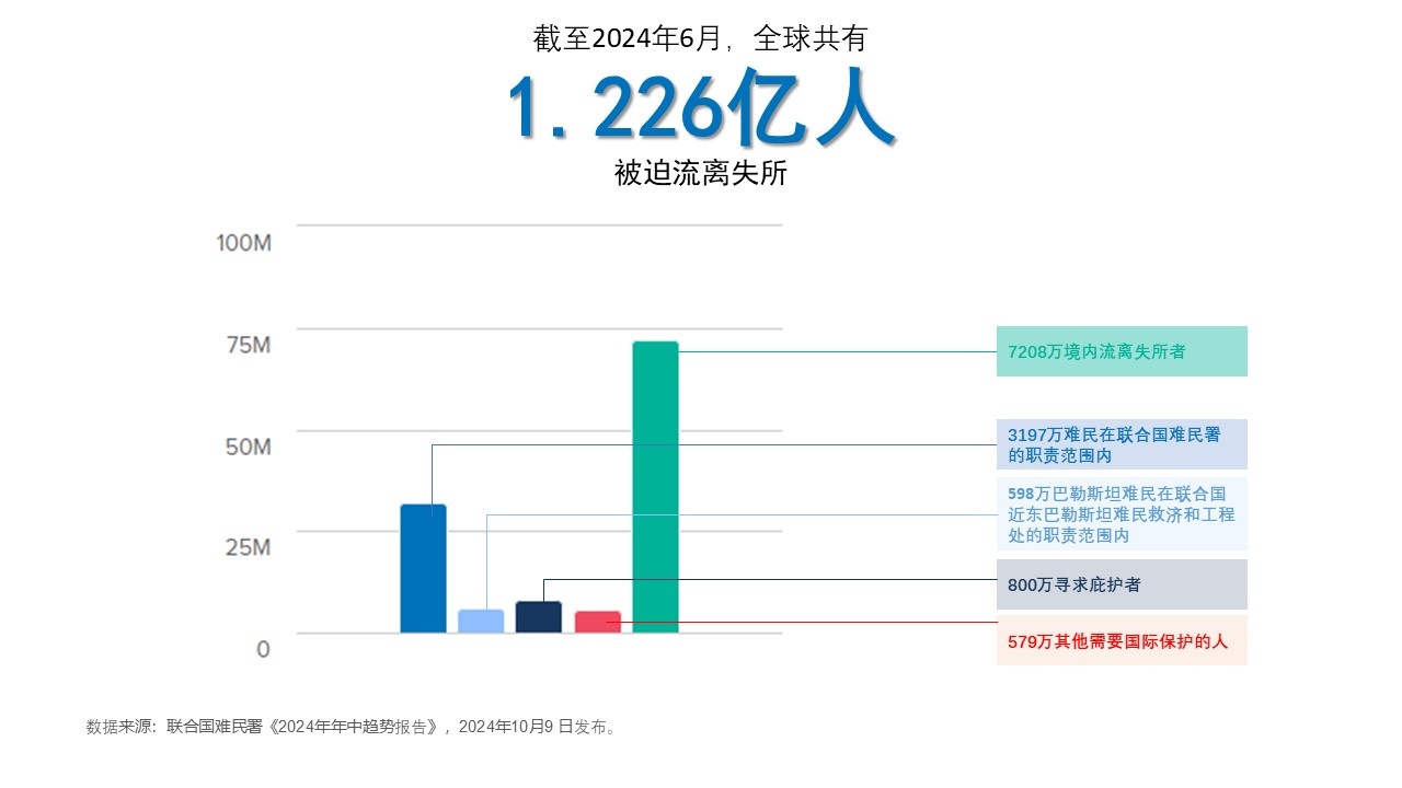 数据一览 数据一览 数据来源:《2024年年中趋势报告》 全球有1.226亿人被迫流离失所。 截至2024年6月底,全球约有1.226亿人被迫逃离家园,其中包括近4370万名难民。此外,还有约440万无国籍者,他们被剥夺了国籍,无法享有基本权利,如教育、医疗、就业和迁徙。当前,全球每67人中就有1人被迫流离失所,联合国难民署的工作比以往任何时候都更加紧迫。 数据来源:联合国难民署《2024年年中趋势报告》,2024年10月9 日发布。