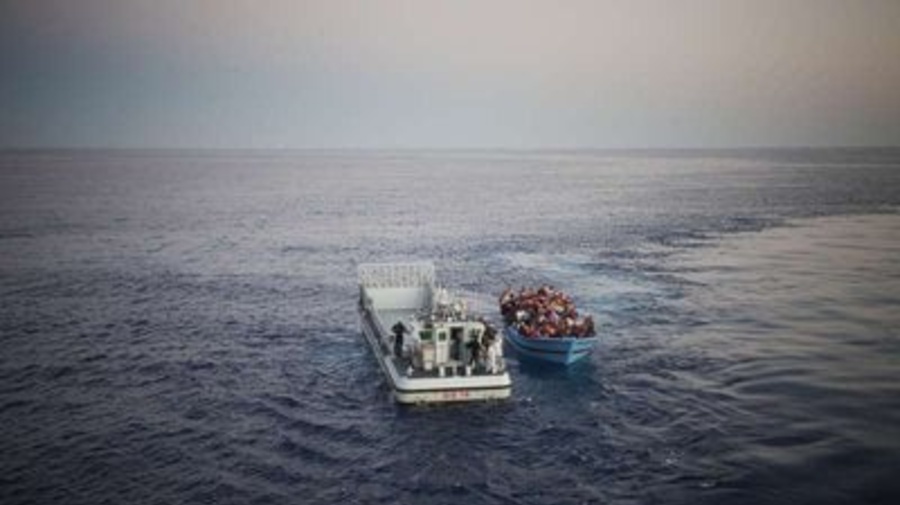 Διασωστικό σκάφος του Ιταλικού πολεμικού ναυτικού προσεγγίζει πλοιάριο με πρόσφυγες και μετανάστες με σκοπό να τους μεταφέρει σε μεγαλύτερο πλοίο που θα τους αποβιβάσει στη στεριά με ασφάλεια.