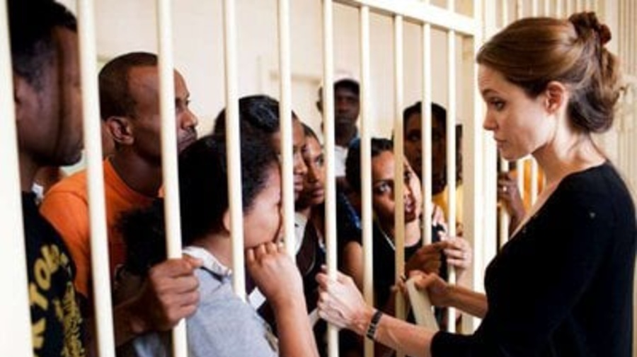Η Αντζελίνα Τζολί συνομιλεί με ανθρώπους των πλοιαρίων που κατέφυγαν στη Λαμπεντούσα για να γλιτώσουν από τη βία στη Βόρειο Αφρική (Ιούνιος 2011)