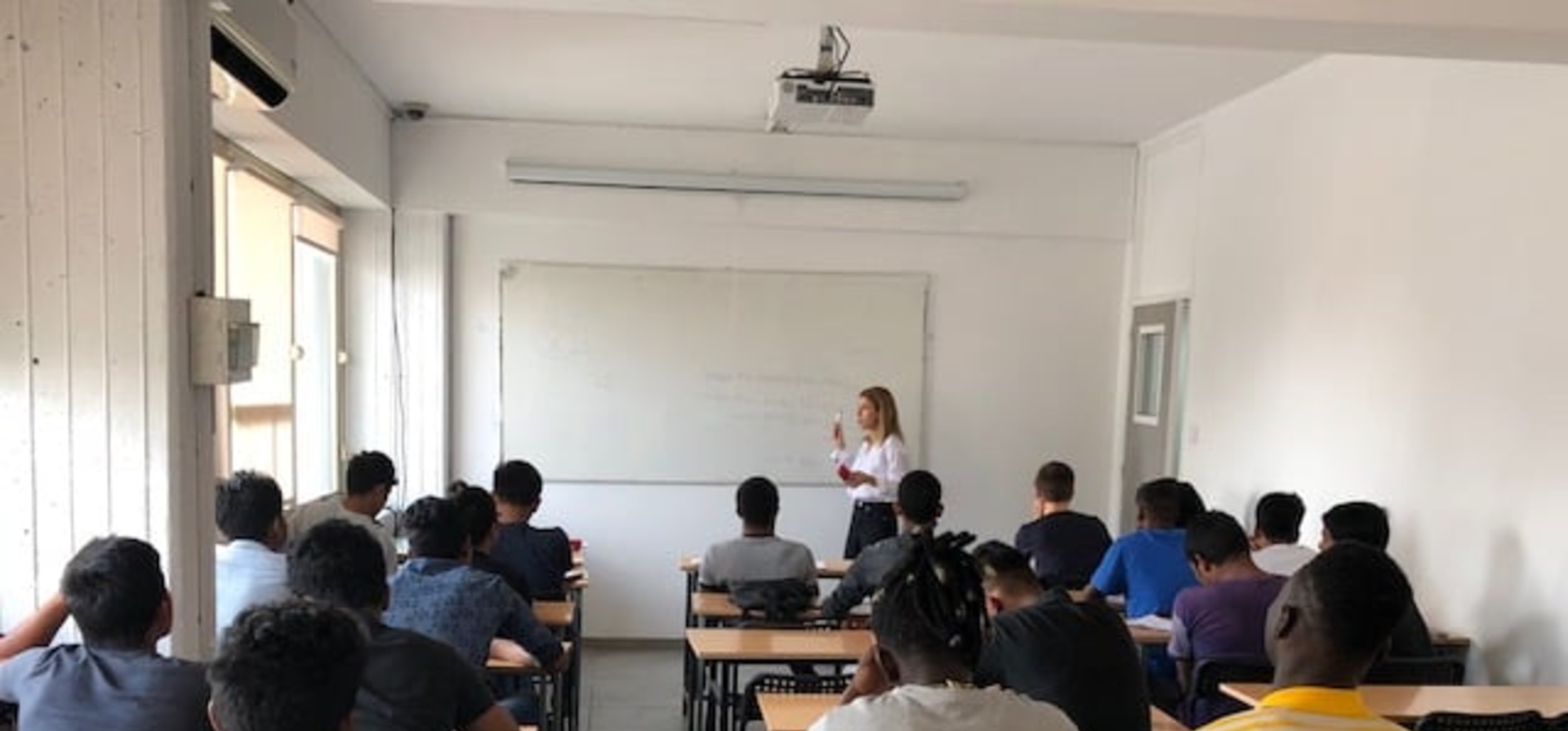 Δεκαπέντε νεαροί αιτητές ασύλου, ηλικίας 16-18 ετών, περιμένουν με ανυπομονησία να ξεκινήσουν το μάθημα των Ελληνικών, ένα απόγευμα Τετάρτης. Εδώ και δύο εβδομάδες ξεκίνησαν μαθήματα στο Λύκειο KASA στο πλαίσιο ενός προγράμματος εκπαίδευσης προσφύγων και μιας ευρύτερης συνεργασίας που υπεγράφη μεταξύ του Γραφείου στην Κύπρο της Ύπατης Αρμοστείας του ΟΗΕ για τους Πρόσφυγες και του Λυκείου KASA τον περασμένο Μάρτιο.