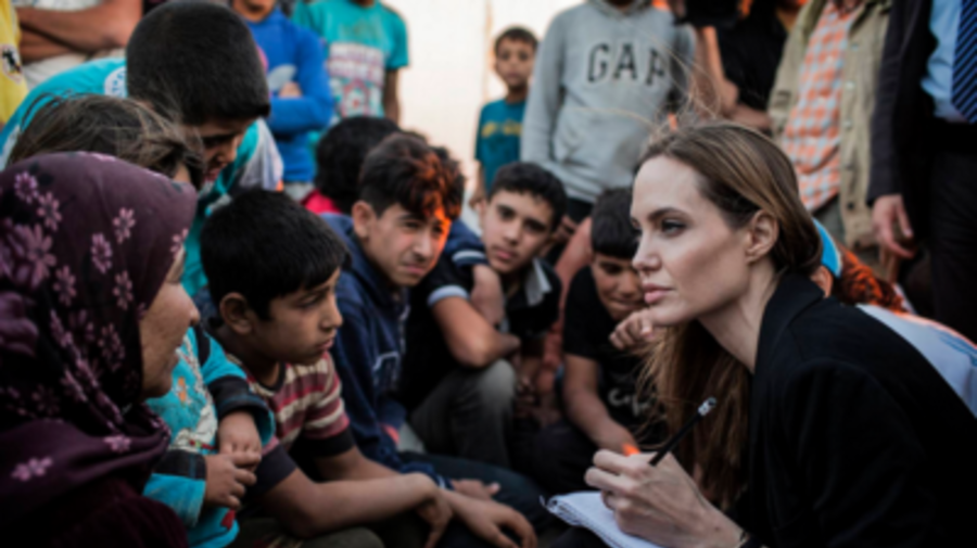 Η Ειδική Απεσταλμένη της Υ.Α. Angelina Jolie Pitt συνομιλεί με παιδιά πρόσφυγες στη συνοριακή γραμμή Συρίας-Ιορδανίας.