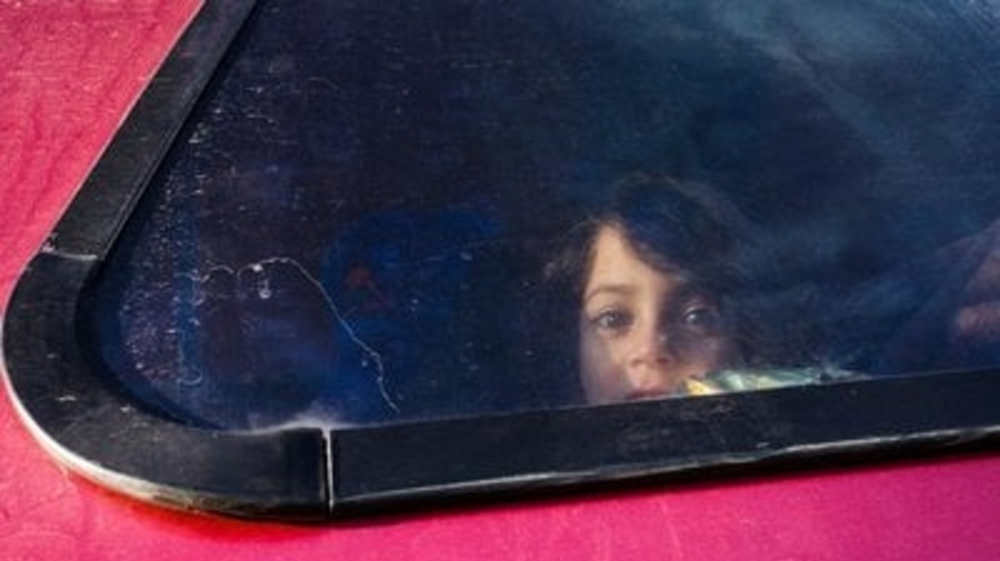 Ένα κορίτσι από τη Συρία κοιτά από το παράθυρο του λεωφορείου λίγο αφού έφτασε στις ακτές της Λέσβου με την οικογένειά της διασχίζοντας το Αιγαίο πάνω σε ένα φουσκωτό.