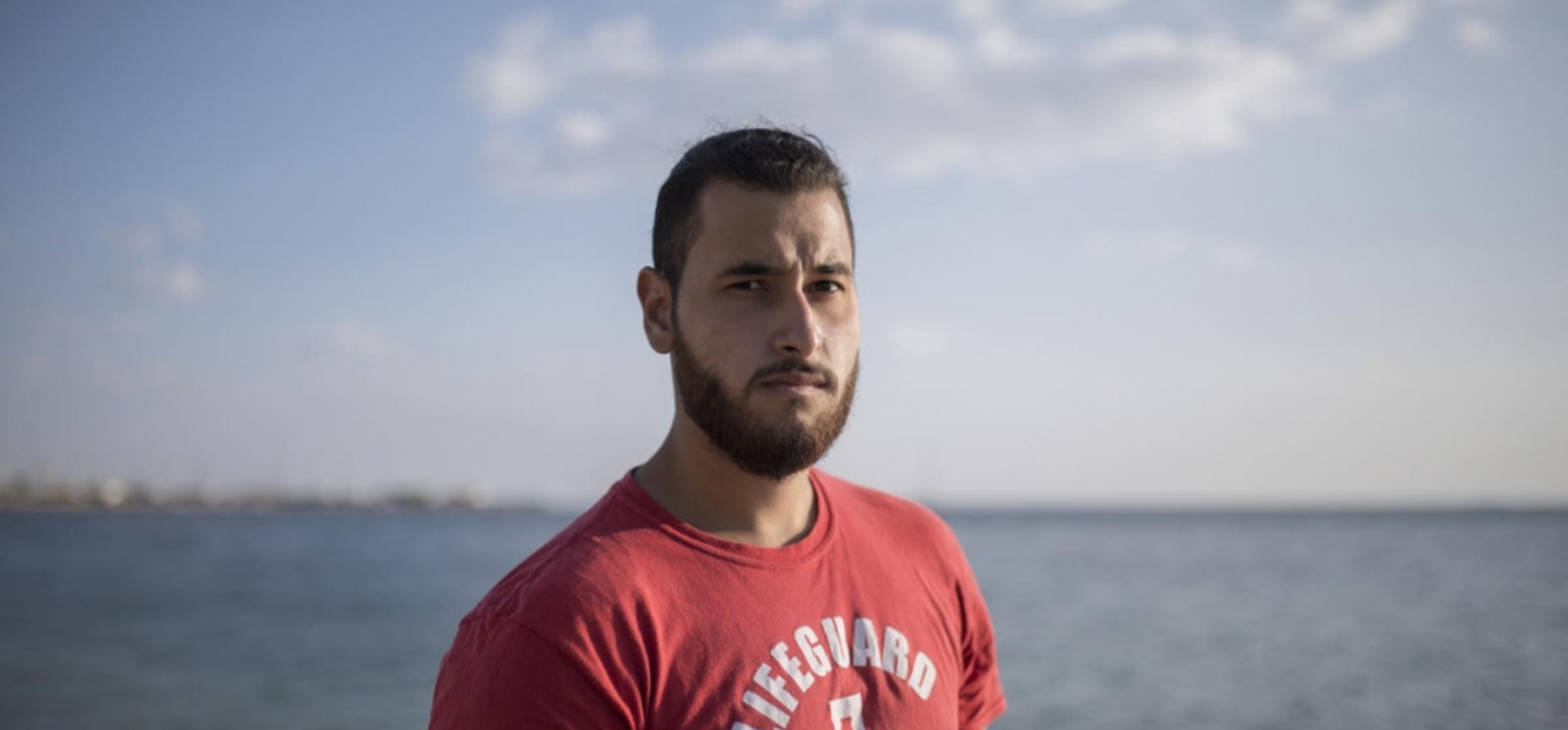 Obada "Ibo" Al-Nassar on lifeguard duty. A Greek naval ship rescued him from the sea when his dinghy began breaking up.