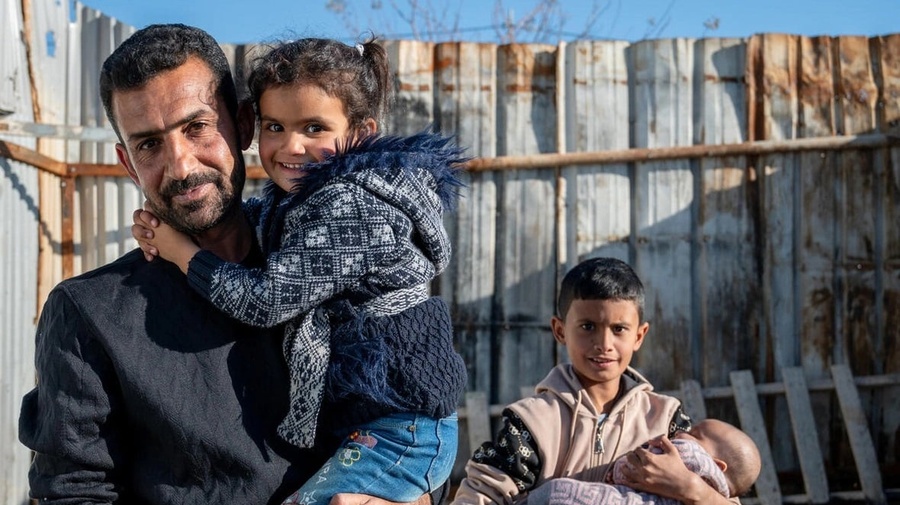 Syrian refugee and father-of-six, Khalid, holds his 5-year-old daughter, Wahid. He and his family have lived in Jordan's Azraq camp since 2016. © UNHCR/Claire Thomas