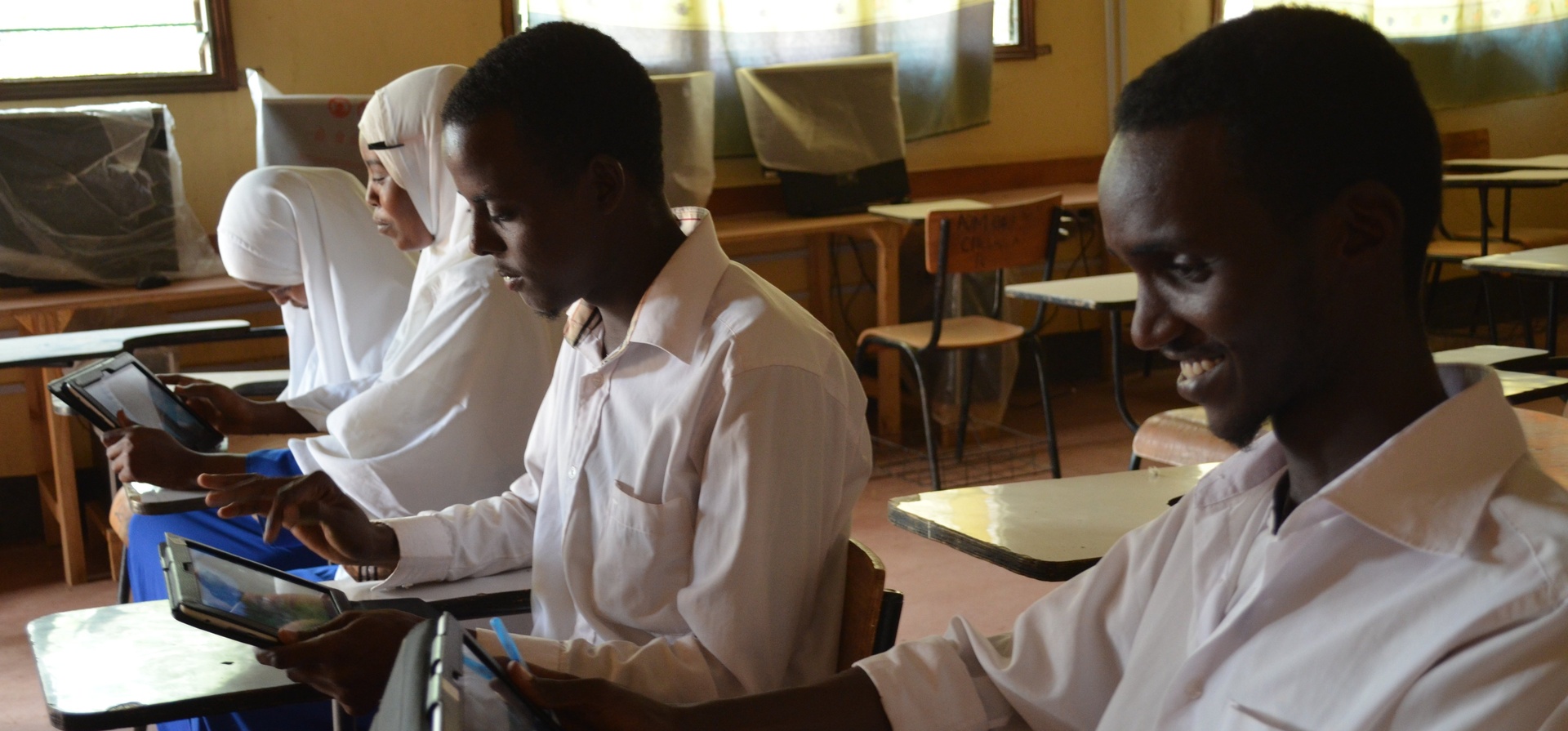 Nasib ist eine der 13 Schulen beziehungsweise Berufsbildungszentren in Dadaab, die im Rahmen eines Ausbildungsprogramms mit Internetzugang ausgestattet wurden. Dieses Ausbildungsprogramm wurde von UNHCR und der Vodafone Stiftung im vergangenen Jahr ins Leben gerufen. Schüler dieser 13 ICT- Zentren, welche unter dem Namen „Instant Network Schools“ bekannt sind und mit Solarenergie betrieben werden, benutzen im Unterricht internetfähige Tablets. Damit können sie Aufgaben erledigen und recherchieren, ihre Lehrer unterstützen sie dabei auf interaktiven Whiteboards. Safaricom, der Vodafone Ableger in Kenia, stellt die Internetanbindung bereit, während die Telekom-Gesellschaft Huawei sechs Grundschulen, drei Mittelschulen und vier Berufsbildungszentren 235 Tablets schenkte. „Der Unterricht war bisher sehr theoretisch, nun ist er auch praktisch. Wir können uns Bilder und Dokumentationen anschauen. So können wir viel besser lernen“, sagt Abdi, ein Schüler der Nasib-Mittelschule, der 1992 aus Somalia flüchtete.