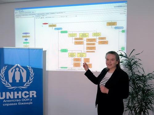 UNHCR-Mitarbeiter treffen ukrainische Flüchtlinge in Bussen auf dem Weg von Slowenien nach Italien. Sie versorgen die Flüchtlinge mit Informationen über das Asylverfahren, Gesundheitsinformationen, Wasser und Essen.