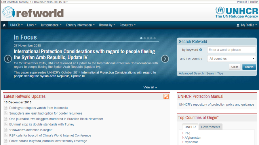 Refworld is the leading source of information necessary for taking quality decisions on refugee status. It contains a vast collection of reports and information relating to situations in countries of origin, policy documents and positions, and documents relating to international and national legal frameworks. The information has been carefully compiled from UNHCR's global network of field offices, governments, international, regional and non-governmental organizations, academic institutions and judicial bodies.Refworld is updated daily.