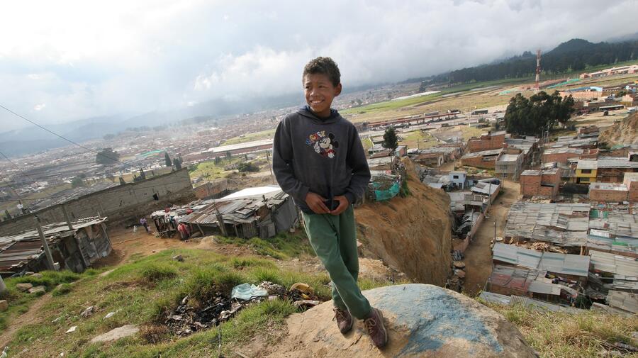 Barrio "Altos de la Florida", shantytown, Bogota. An IDP child stands where one of his friends recently fell down a 50 meters high rock barrier located just next to their houses.
