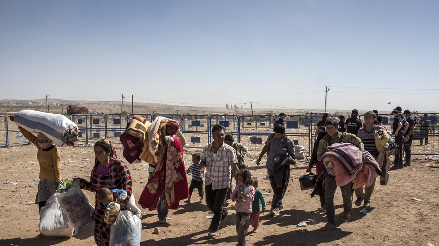 Des réfugiés kurdes syriens traversent la frontière vers la Turquie après avoir fui les combats entre les forces kurdes et les militants d'ISIS dans la ville de Kobani au nord-est de la Syrie.