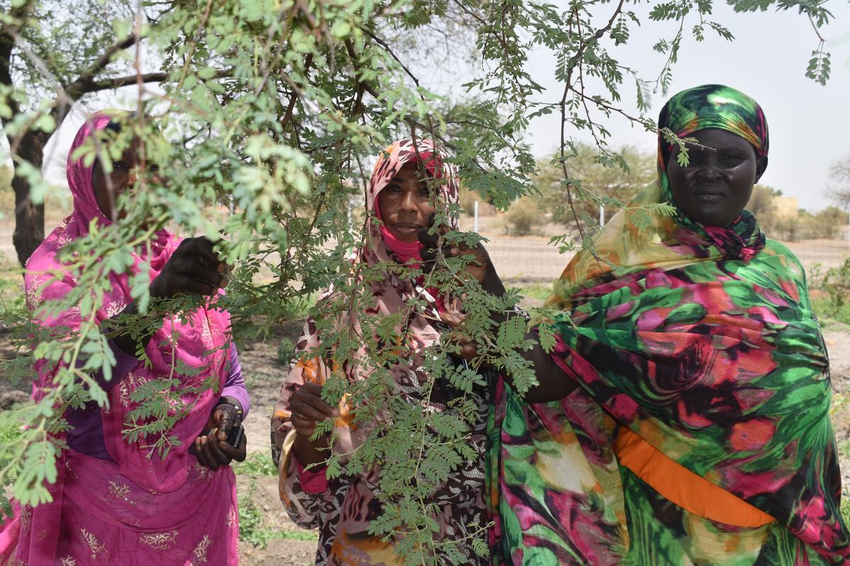 Geal (à droite) se tient aux côtés de femmes soudanaises avec lesquelles elle travaille à la pépinière.