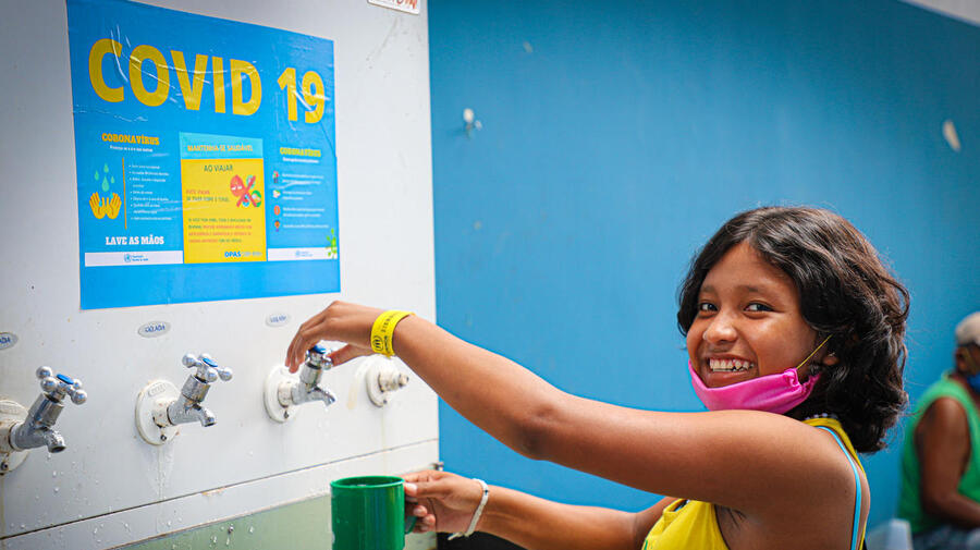Une jeune réfugiée vénézuélienne utilise une station d'eau potable dans un centre d'hébergement de la ville brésilienne de Manaus.