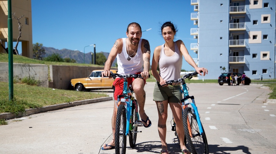 Majd et Lana posent avec leurs bicyclettes devant leur immeuble à San Luis, dans le centre de l'Argentine.