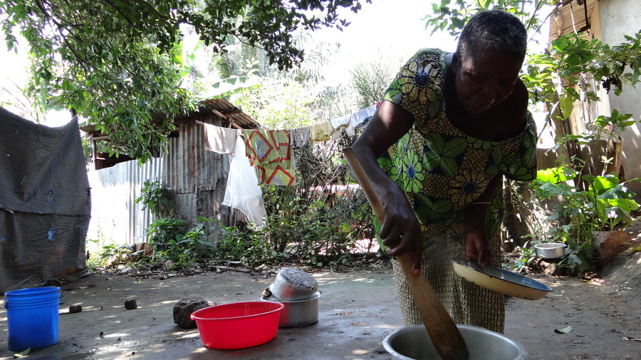 Mama Furaha prépare le repas dans le jardin de son amie Cady, qui l'héberge ainsi que ses petits-enfants.
