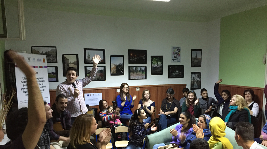La salle est pleine de réfugiés, qui essaient de réussir leur nouvelle vie en Roumanie, et de résidents, comme l’organisateur de la fête, Flavius Ilioni‑Loga, de l’organisation œcuménique AIDRom, qui facilite l’intégration des réfugiés en leur proposant des services sociaux, tels que des séances de counseling, des cours ou une aide au logement. AIDRom organise aussi des rencontres multiculturelles.