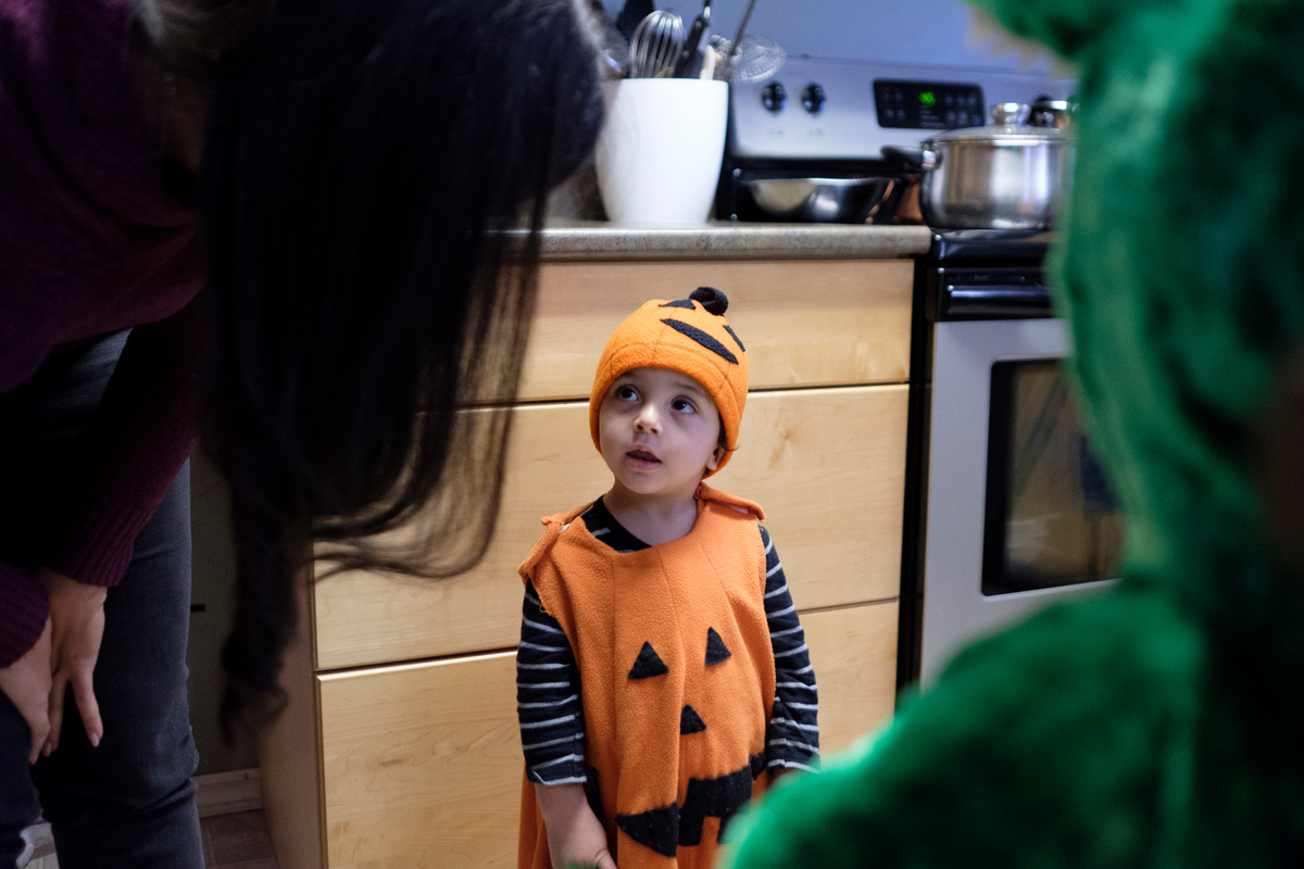 Chaque fois que l'on sonne à la porte, ils échangent des regards incertains, encore indécis sur ce qu'il faut faire. C'est l'aîné qui sort de l'impasse en se précipitant dans l'escalier pour aller distribuer des bonbons. Les plus jeunes ne tardent pas à se joindre aux enfants d'à côté pour aller récolter de porte en porte des sacs lourds de gourmandises. C’est leur toute première fête d'Halloween au Canada.
