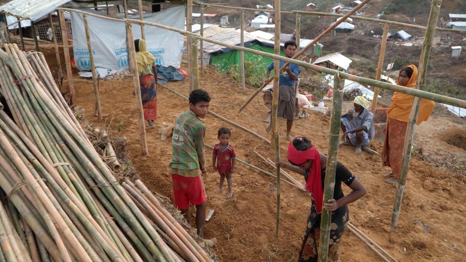 Pendant les premières semaines suivant l'arrivée au Bangladesh des réfugiés rohingyas du Myanmar à la fin août, le temps a manqué pour planifier l'emplacement et la construction des logements. Des abris basiques contre les éléments ont été aménagés au moyen des bambous et des bâches disponibles sur place.