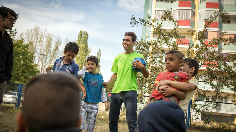 Les huit jeunes dont s’occupe Hassan cet après-midi ont tous moins de 10 ans. Ce sont des réfugiés d’Afghanistan, d’Irak et de Syrie. Tous les lundis, Hassan et ses collègues du projet berlinois Ankommen d’accueil de jeunes organisent leur ramassage dans les abris et les conduisent jusqu’à un club de jeunes à proximité. C’est l’occasion d’éliminer l’excédent d’énergie, de jouer et d’apprendre des choses.