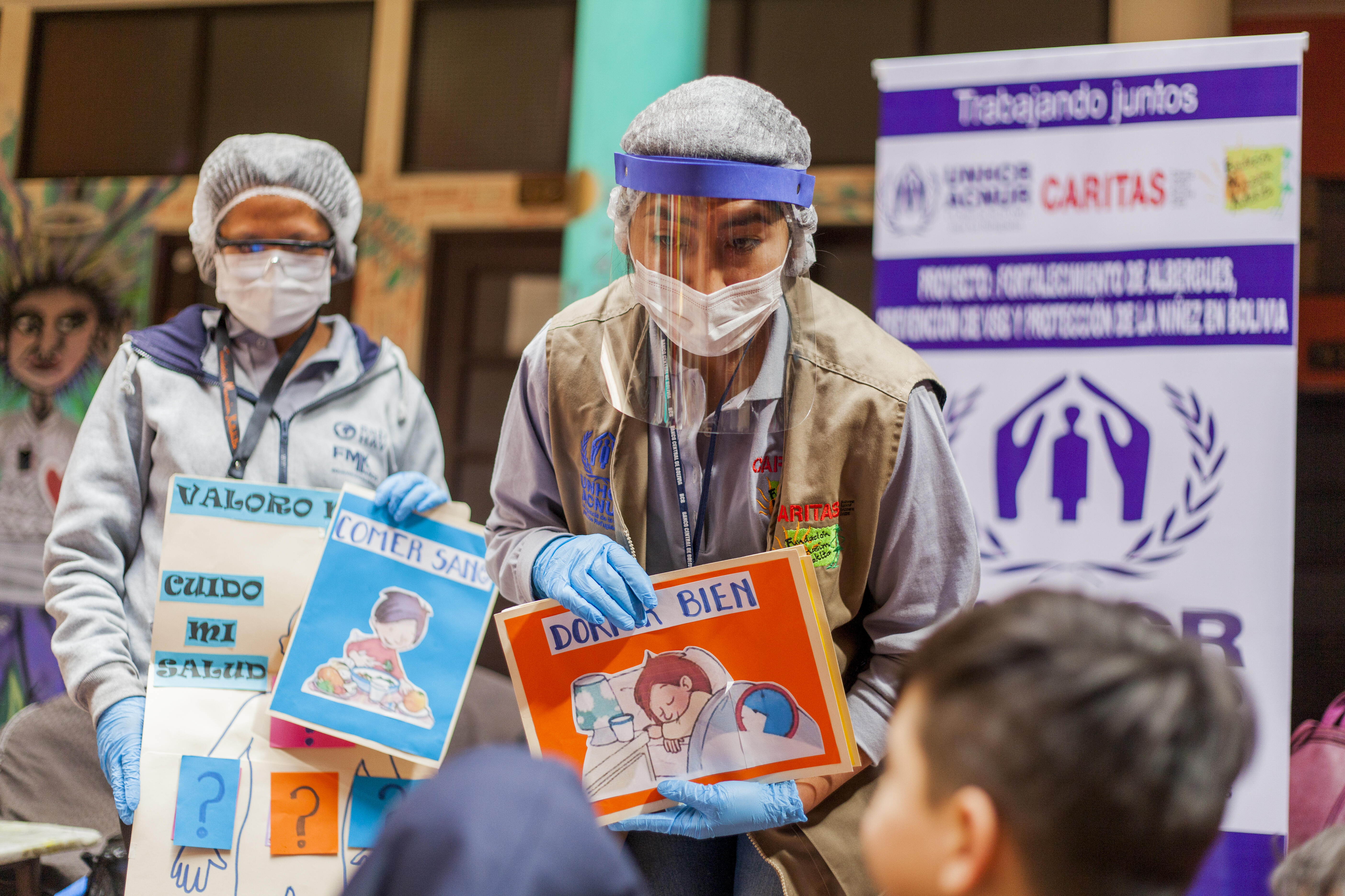 Aula Movil (Classe mobile) est un projet piloté par le HCR et des organisations partenaires pour les enfants vénézuéliens réfugiés et migrants qui n'ont pas eu accès à l'éducation formelle, à l'enseignement à distance ou aux activités récréatives depuis la fermeture de l'école. Bien que le personnel soit vêtu d'un équipement de protection individuelle de la tête aux pieds, les jeunes s'y habituent rapidement.