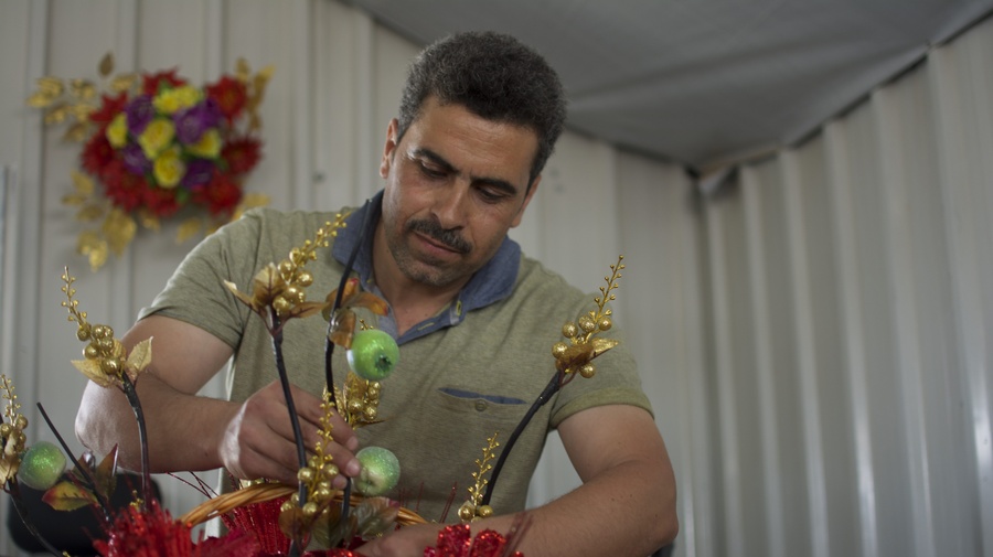 Dans l'une des échoppes, Mohammad, 42 ans, originaire du gouvernorat de Daraa, au sud de la Syrie, était affairé à la vente de bouquets de fleurs artificielles aux couleurs éclatantes confectionnées par ses soins. Ingénieur chauffagiste de métier, il a commencé à créer ces compositions florales élaborées chez lui lorsque le conflit en Syrie l'a contraint à cesser les déplacements professionnels.