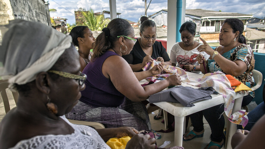 Un groupe de femmes à Buenaventura participent à un atelier de couture organisé par les Papillons.