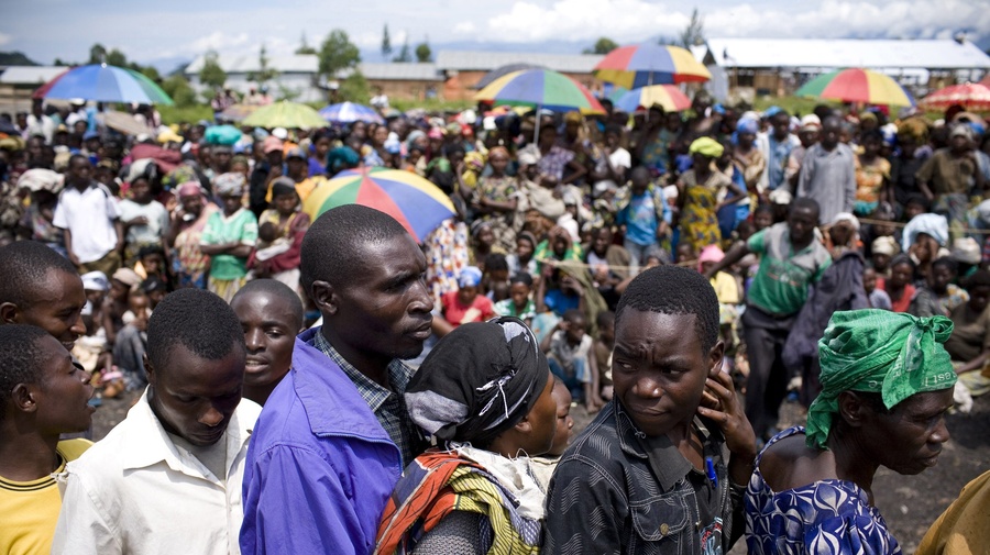 Plus tôt ce mois, des déplacés internes congolais font la queue pour recevoir de l'aide sur le site de Mugunga à côté de Goma, Nord-Kivu.