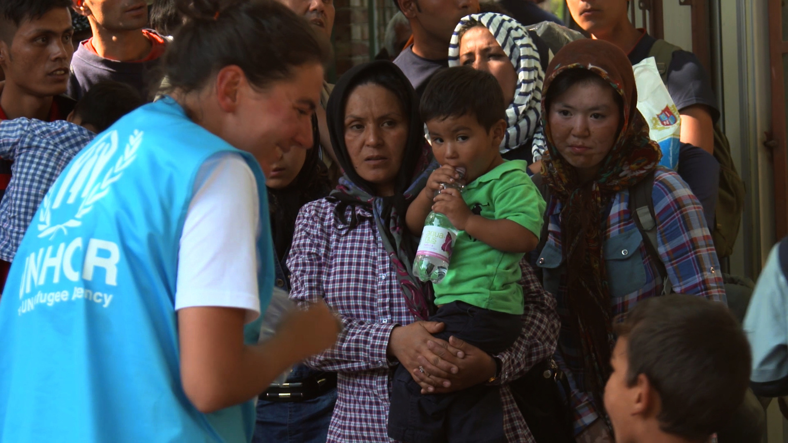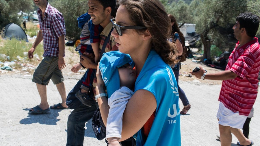 Une employée du HCR transporte un bébé déshydraté vers un dispensaire pour qu'il reçoive des soins au camp de Moria, Lesbos, Grèce.