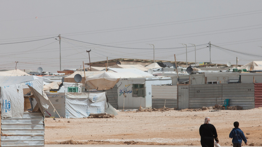 Des réfugiés syriens traversent à pied le camp de Zaatari en Jordanie. Photo d'archive. Mars 2013.