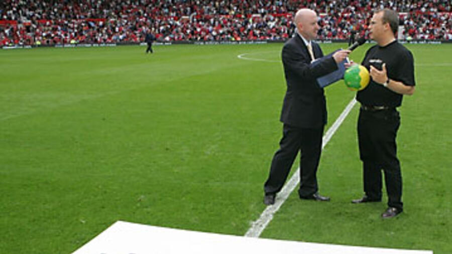 Le commentateur du stade Old Trafford Alan Keegan lors de son interview diffusée dans le stade avec Peter Kessler de l'UNHCR.