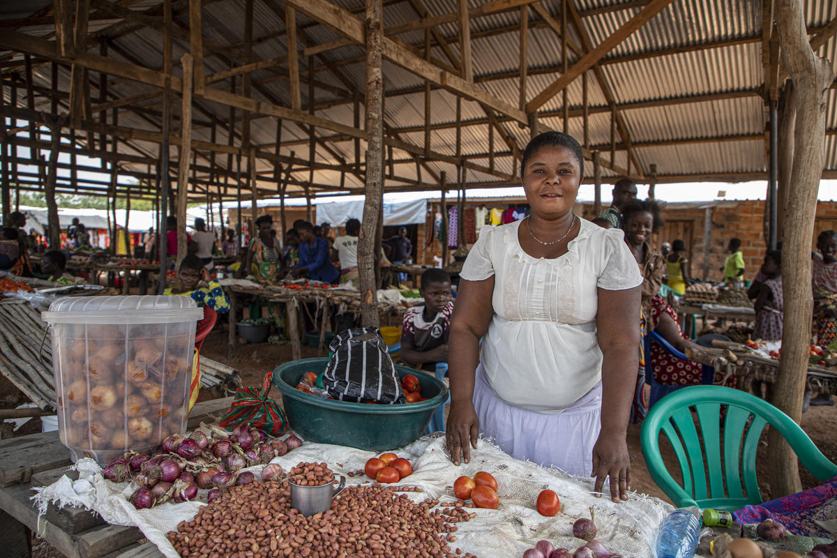 Mukea Chungu, une marchande originaire de Pweto dans la province du Katanga en République démocratique du Congo, tient un étal au marché où elle vend des tomates, des oignons et d'autres produits frais. Elle a pu lancer sa petite affaire grâce à des fonds obtenus via le programme du HCR pour les moyens d'existence.
