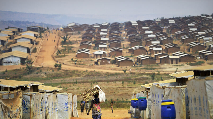 Une femme rapporte du bois vers son abri pour faire du feu, au camp de réfugiés de Mahama, dans la province orientale du Rwanda. À la tombée de la nuit, le camp est plongé dans l'obscurité.
