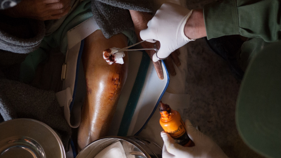 CAMP DE REFUGIES DE ZA'ATRI, Jordanie, 21 février (HCR) - Mustapha* est assis sur un matelas en mousse à l'intérieur d'une tente hôpital verte et il essaye de contenir sa douleur. Les brûlures ont fait disparaître la peau sur ses jambes, les laissant pliées à un angle de 45 degrés. Des médecins marocains de l'hôpital de campagne du camp de Za'atri en Jordanie ont évité que le corps de ce blessé ne s'infecte. Bientôt, il sera transféré vers un autre établissement pour y subir une chirurgie plastique et on espère qu'il pourra bientôt marcher à nouveau.
