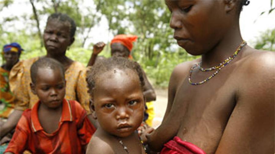 Un groupe de mères avec leurs enfants dans la brousse. Ils n'ont accès ni à l'eau potable, ni aux soins de santé et ne s'alimentent pas régulièrement.